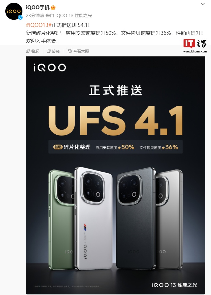IT之家 11 月 11 日消息,iQOO 官方今日发文宣布,iQOO 13 手机正式推送 UFS 4.1,新增碎片化整理功能,宣称“应用安装速度提升 50%、文件拷贝速度提升 36%”。