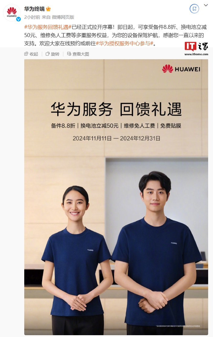 IT之家 11 月 11 日消息,华为终端今日发文宣布,今日起开启华为服务回馈礼遇活动,用户即日起可享受备件 8.8 折、换电池立减 50 元、维修免人工费等服务权益。