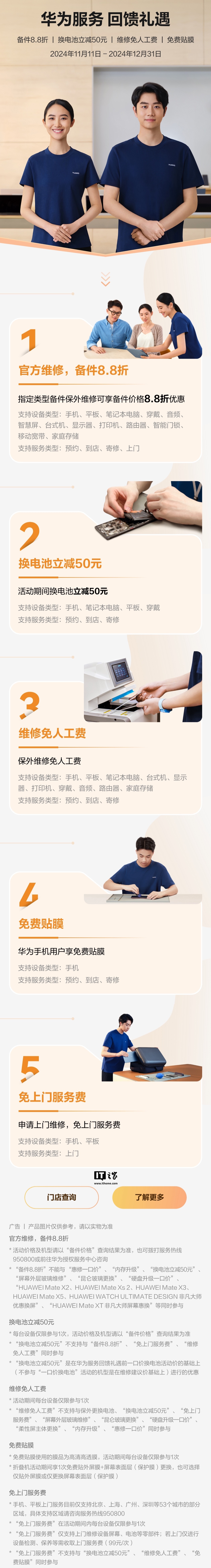文章来源于互联网:IT之家-华为服务回馈礼遇活动开启:备件 8.8 折、换电池立减 50 元、维修免人工费等