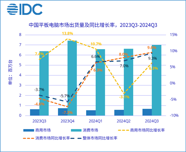 报告显示,2024年第三季度中国平板电脑市场出货量达到768万台,同比增长9.3%,连续三个季度保持出货量正增长。