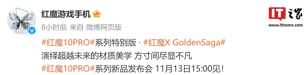 IT之家 11 月 12 日消息,红魔游戏手机官方今日公布了红魔 10 PRO 系列手机特别版“红魔 X Golden Saga”,Slogan 为“演绎超越未来的材质美学,方寸间尽显不凡”。