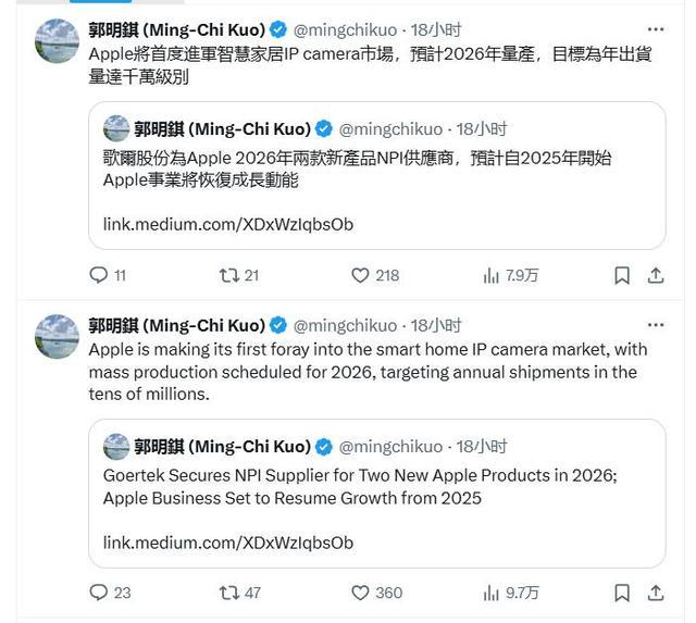 郭明錤称,这一战略举措表明苹果正在不断探索家居市场的增长机会。他相信,通过苹果强大的生态系统以及与Apple Intelligence 和 Siri 的深度结合,相关摄像头的用户体验将得到显著提升。