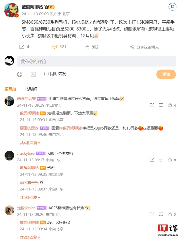 博主在评论区中回复了部分网友的问题:针对新机手感问题,博主称“容量没加到顶,不然太厚重”;针对小米 Redmi K80 系列新机是否下周发布,博主回复“预热”;针对一加 Ace 5 标准版是否有长焦,博主表示“没,50+8+2”。