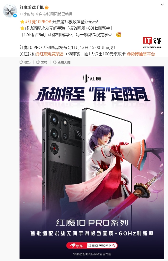 据红魔官方介绍,红魔 10 Pro 系列手机首批适配游戏《永劫无间手游》极致画质 + 60Hz 刷新率。需要注意的是,具体适配时间以游戏公告为准