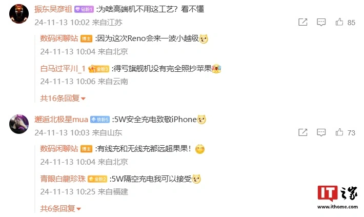 有网友询问为什么高端机不使用该工艺,博主称“因为这次 Reno 会来一波小越级”。另有网友“调侃”新机 5W 安全充电致敬 iPhone,博主回评“有线充和无线充都远超果果”,暗指新机将支持无线充电。