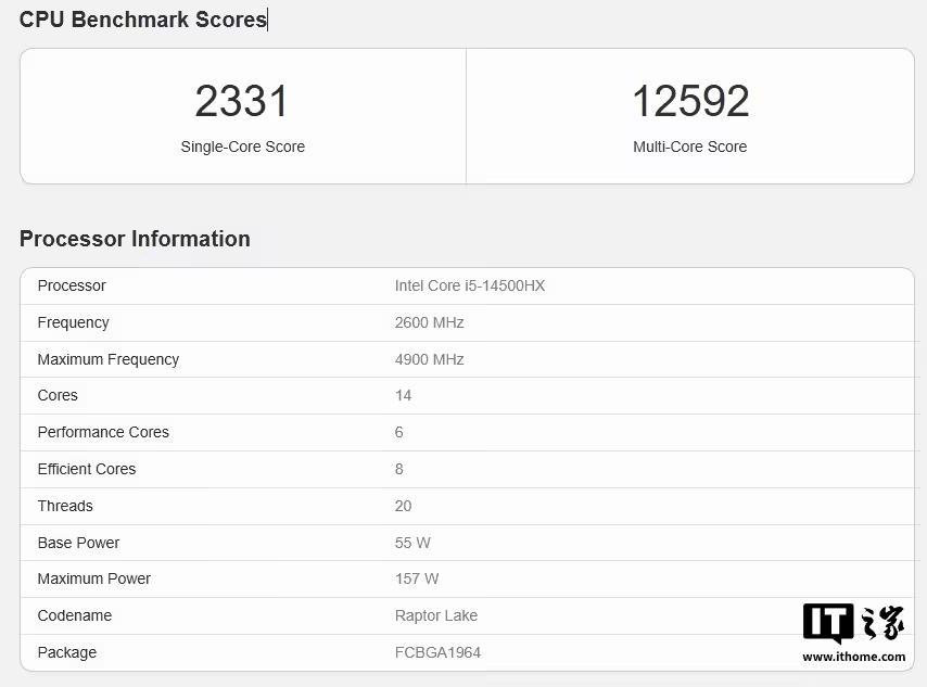 酷睿 i5-14500HX(55~157W)单多核分别为 2331、12592 分;