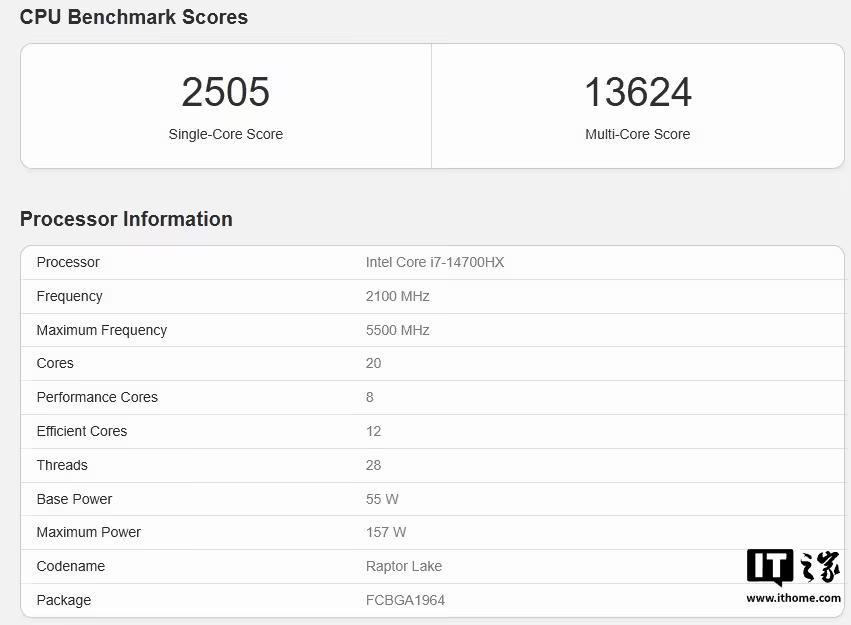 i7-14700HX(55~157W)为 2505、13624 分;