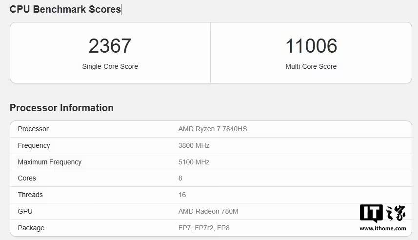 AMD R7 7840HS(35-54W)单核 2367 分,多核 11006 分;
