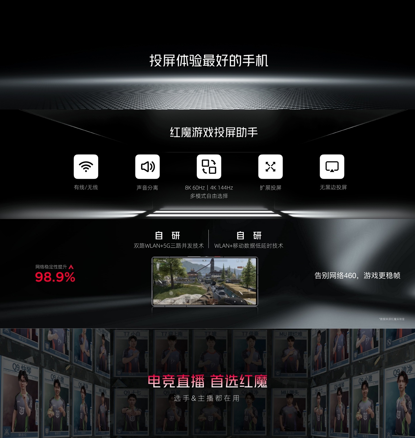 红魔官方还提供红魔游戏投屏助手,支持有线 / 无线模式、声音分离、8K 60Hz|4K 144Hz 多模式自由选择、拓展投屏、无黑边投屏等功能,号称“自研技术⽹络稳定性提升 98.9%”。