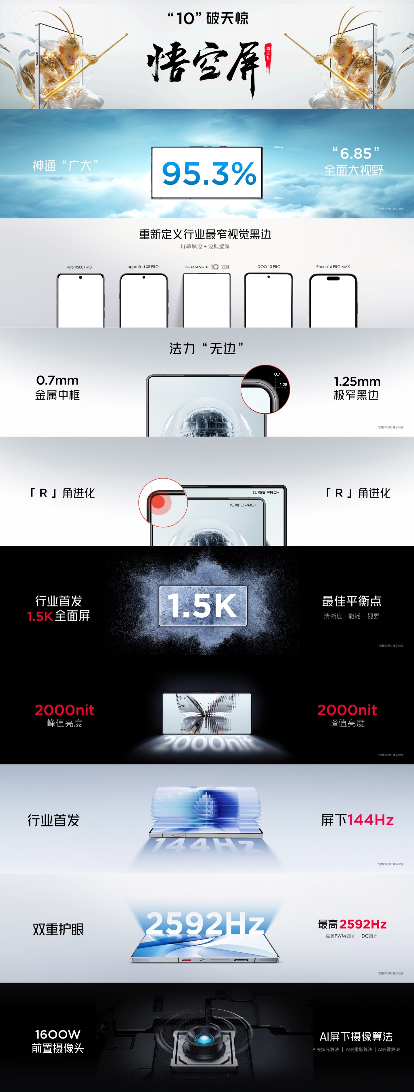IT之家 11 月 13 日消息,红魔 10 Pro 系列手机今日正式发布,该机配备 6.85 英寸、95.3% 屏占比“悟空屏”,拥有 1.25mm 窄黑边 + 0.7mm 窄边框壁厚。另外,红魔 10 Pro 系列手机还首发 1.5K 全面屏、支持 144Hz 高刷、峰值亮度 2000nit。