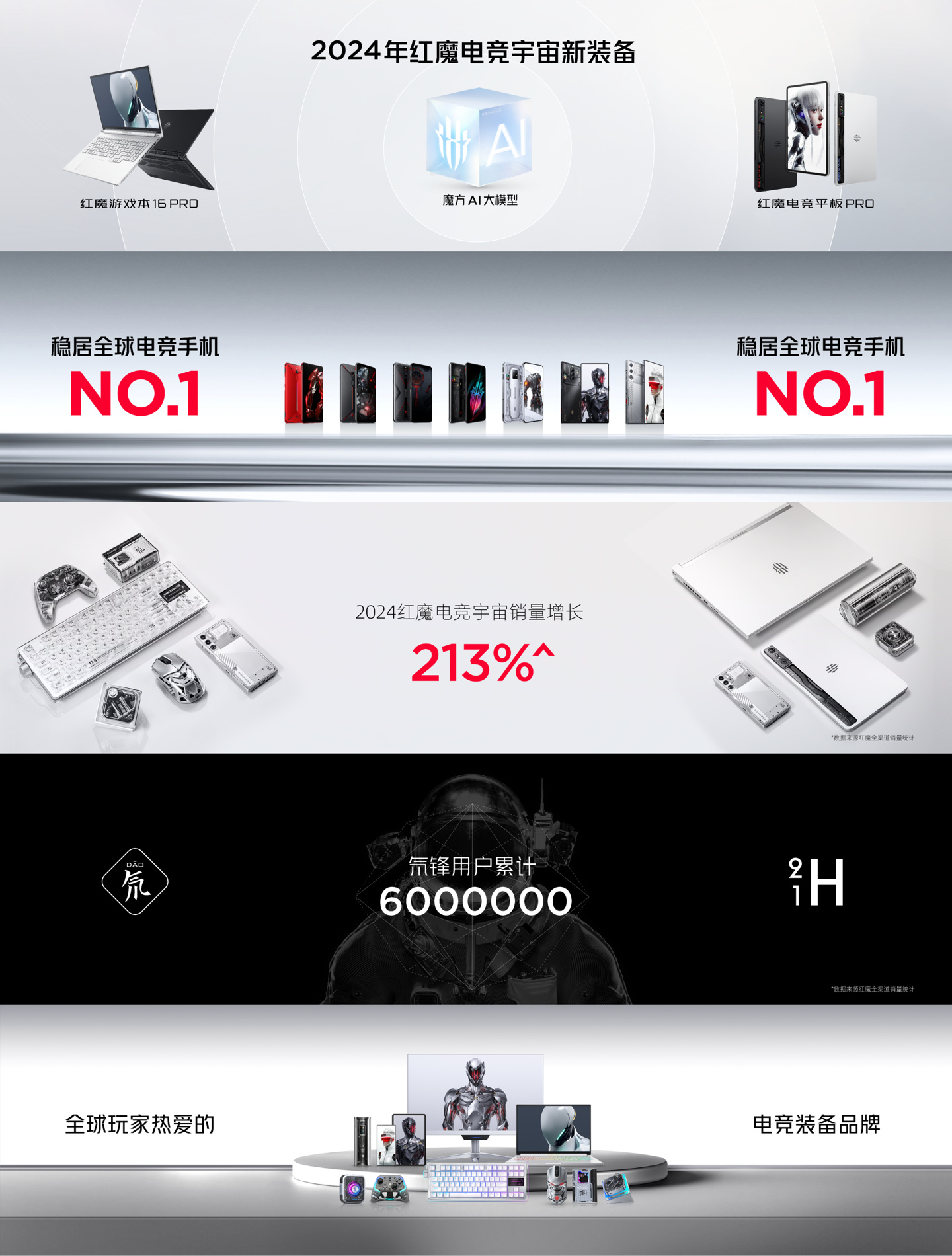 此外,倪飞还公布了红魔游戏手机系列产品更多成绩:红魔游戏手机居全球电竞手机 NO.1、2024 红魔电竞宇宙销量增长 213%。