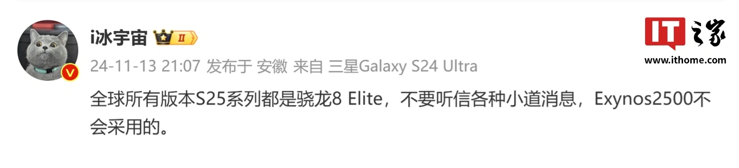 IT之家 11 月 13 日消息,博主 @i冰宇宙 今晚透露,全球所有版本 S25 系列都是骁龙 8 Elite(即骁龙 8 至尊版),不要听信各种小道消息,Exynos 2500 不会采用的。