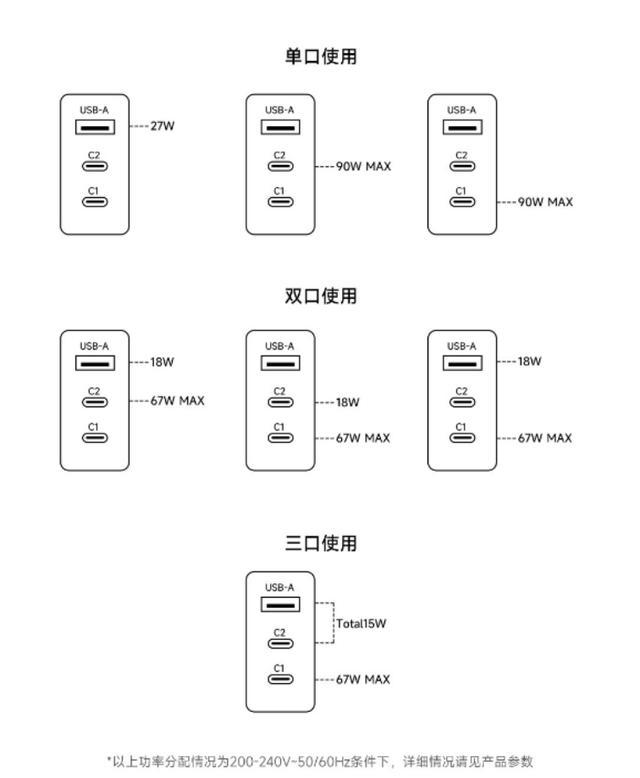 据介绍,小米 90W GaN 三口充电器套装任意 Type-C 单口均可实现最大 90W 功率输出;任意双口搭配使用,均可输出最大 67W+18W 充电功率;三口同时可输出 67W Max(USB-C1)+15W(C2+A)功率。
