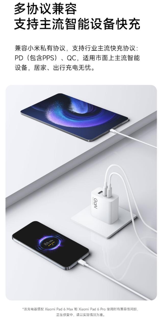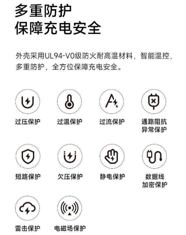 该款充电器兼容小米私有协议,支持 PD(包含 PPS)、QC 行业主流快充协议;充电器外壳采用 UL94-V0 级防火耐高温材料,支持智能温控、多重防护。