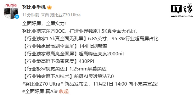 IT之家 11 月 14 日消息,努比亚今日官宣 Z70 Ultra 新品手机发布会定档 11 月 21 日 14:00,随后该品牌公布了这款新机的屏幕参数。