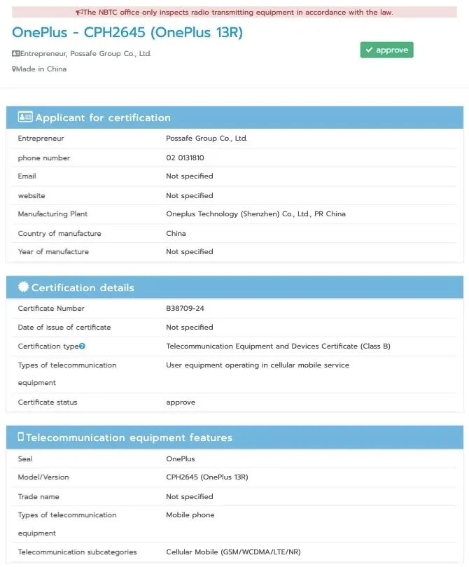 MySmartPrice 发现,OnePlus 13R 已经获得了 NBTC、SGS Fimko 认证,而且还出现在全球认证论坛 (GCF) 的列表中。