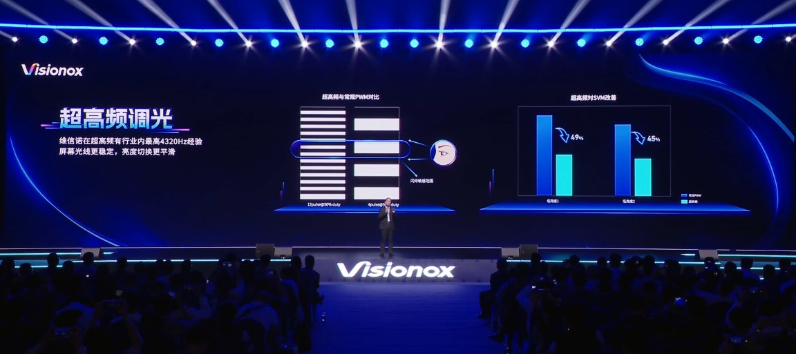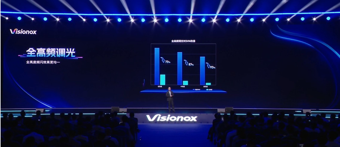 而为了解决这个问题,维信诺通过技术创新,实现了全高频调光护眼技术,即通过将高亮下类 DC 调光模式改为 PWM 调光模式 (与低亮时一致),从而减少屏闪,提升观看体验与眼睛舒适度,来达到护眼目的。