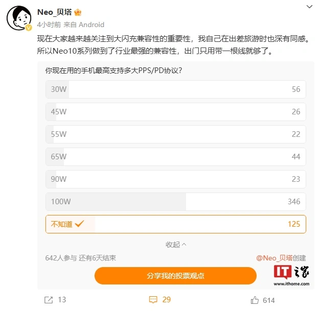 此外,iQOO Neo 产品经理 @Neo_贝塔 还在微博中对新机的快充兼容情况进行说明,称 Neo10 系列手机“做到了行业最强的兼容性,出门只用带一根线就够了”,并附上各档位 PPS / PD 协议快充功率的投票,包括:30W、45W、55W、65W、90W 和 100W。