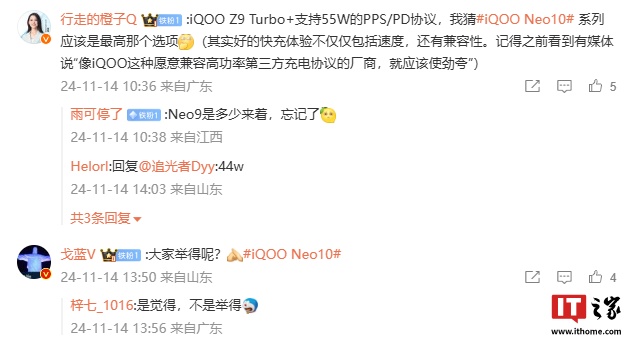 IT之家注意到,iQOO 产品经理 @行走的橙子Q 在该微博下留言回复“iQOO Z9 Turbo + 支持 55W 的 PPS / PD 协议,我猜 iQOO Neo10 系列应该是最高那个选项”,此举暗示新机有望支持最大 100W PPS / PD 快充。