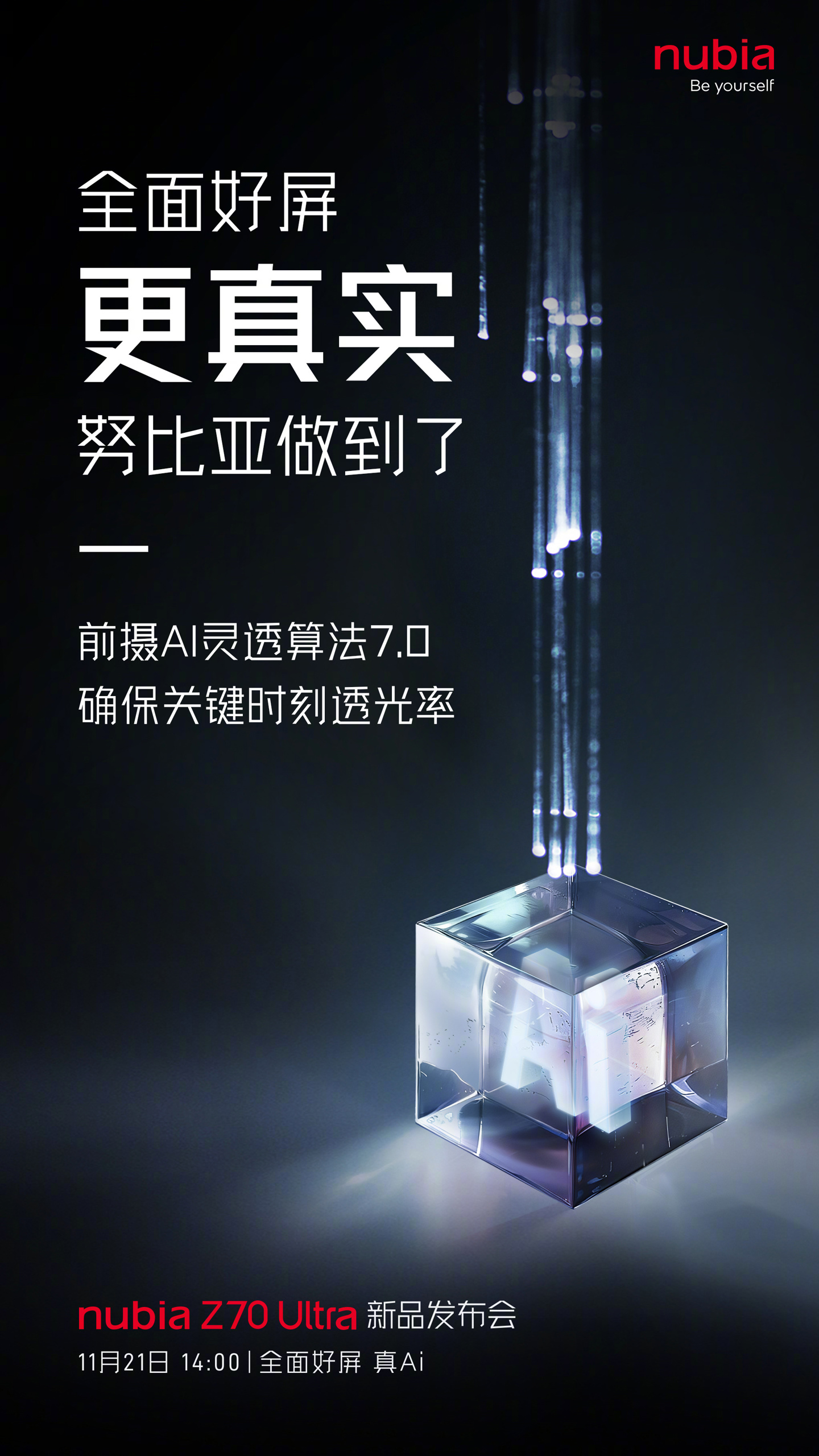 IT之家 11 月 14 日消息,努比亚 Z70 Ultra 手机今日官宣将于 11 月 21 日发布,新机将配备 6.85 英寸、95.3% 屏占比 1.5K 真全面无孔屏。