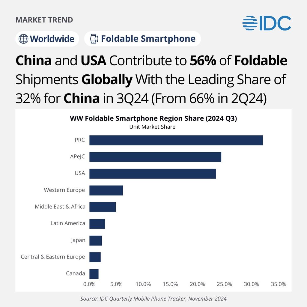 2024 年第 3 季度中国可折叠手机市场占有率为 32%,美国和中国合起来占有率为 56%。