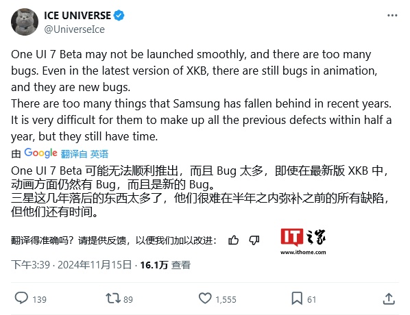 IT之家 11 月 16 日消息,消息源 @i冰宇宙 昨日(11 月 15 日)在 X 平台发布推文,曝料称三星 One UI 7.0 更新由于 BUG 太多,导致迟迟无法启动 Beta 更新。