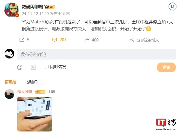 另据IT之家 11 月 12 日报道,博主 @数码闲聊站当时发文称“华为 Mate70 系列有真机泄露,可以看到居中三挖孔屏,金属中框类似直角 + 大倒角过渡设计,电源按键尺寸变大,增加识别面积”。