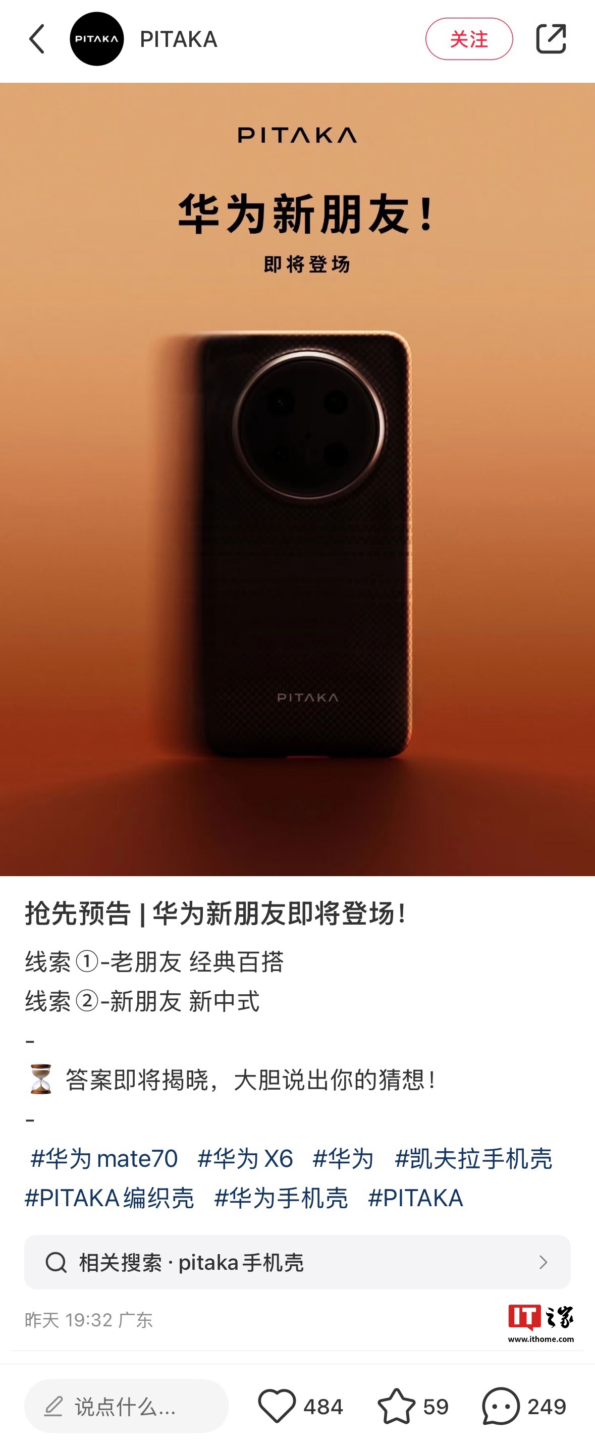 IT之家 11 月 16 日消息,制造商 PITAKA 在小红书上发文,预告了一款为“华为新朋友”打造的手机壳,其贴文内关键词带有“华为 mate70”、“华为 X6”、“华为”、“凯夫拉手机壳”等字样。