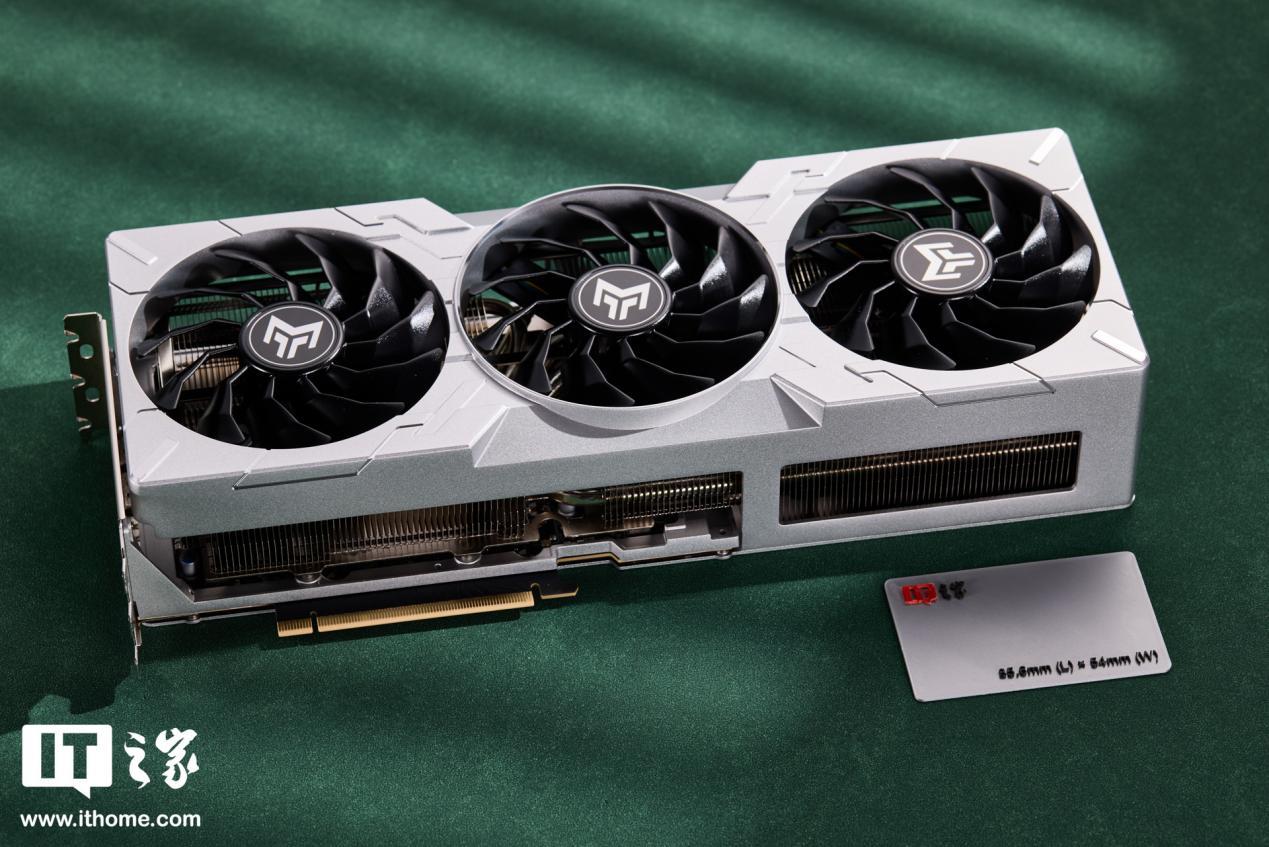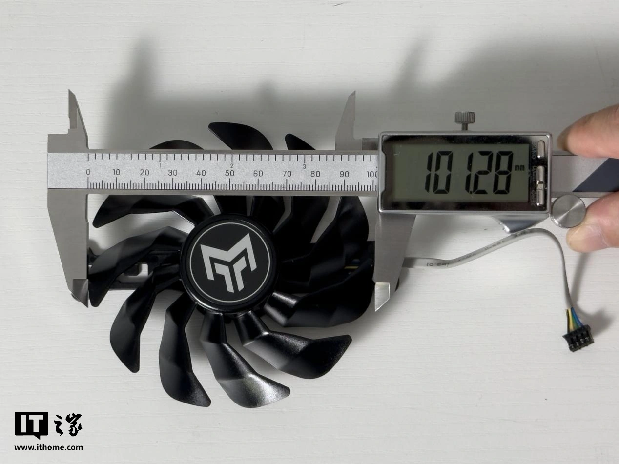 最后是散热风扇,IT之家实测直径在 10cm 以上,这套散热模组压得住 RTX 4090,应对 RTX 4070 Ti Super 更是轻轻松松。