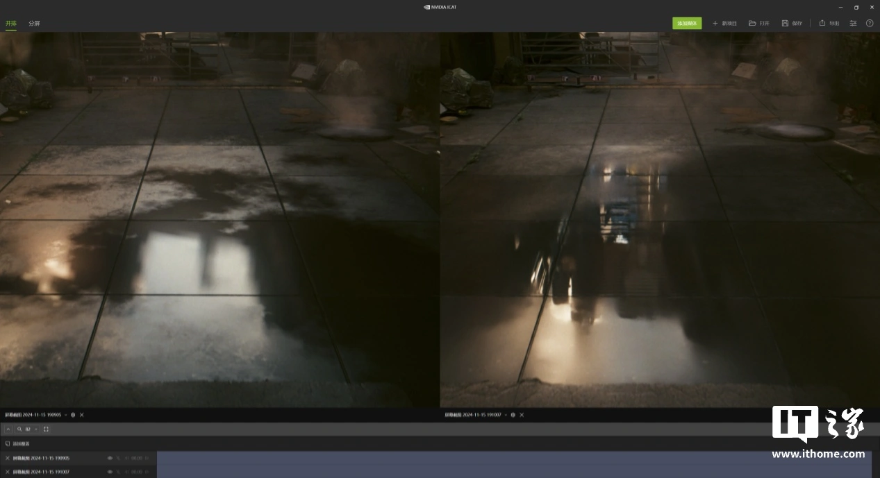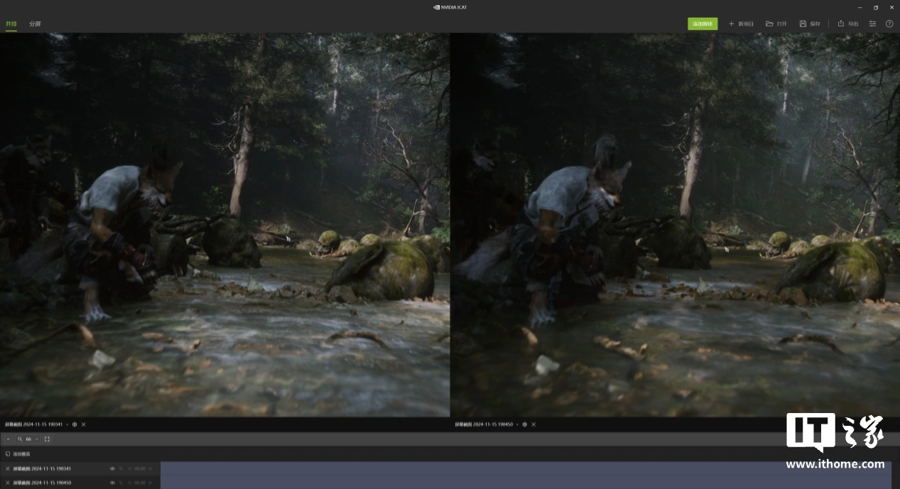 与此同时,我们使用 OBS 与采集卡记录了输出的画面,并截取同一场景的一帧使用英伟达的 ICAT 工具对比画质。开启 DLSS3.5 后无论是近处的水面折射,远处森里的暗部细节,还是狐狸头上的烟雾都要更加清晰。