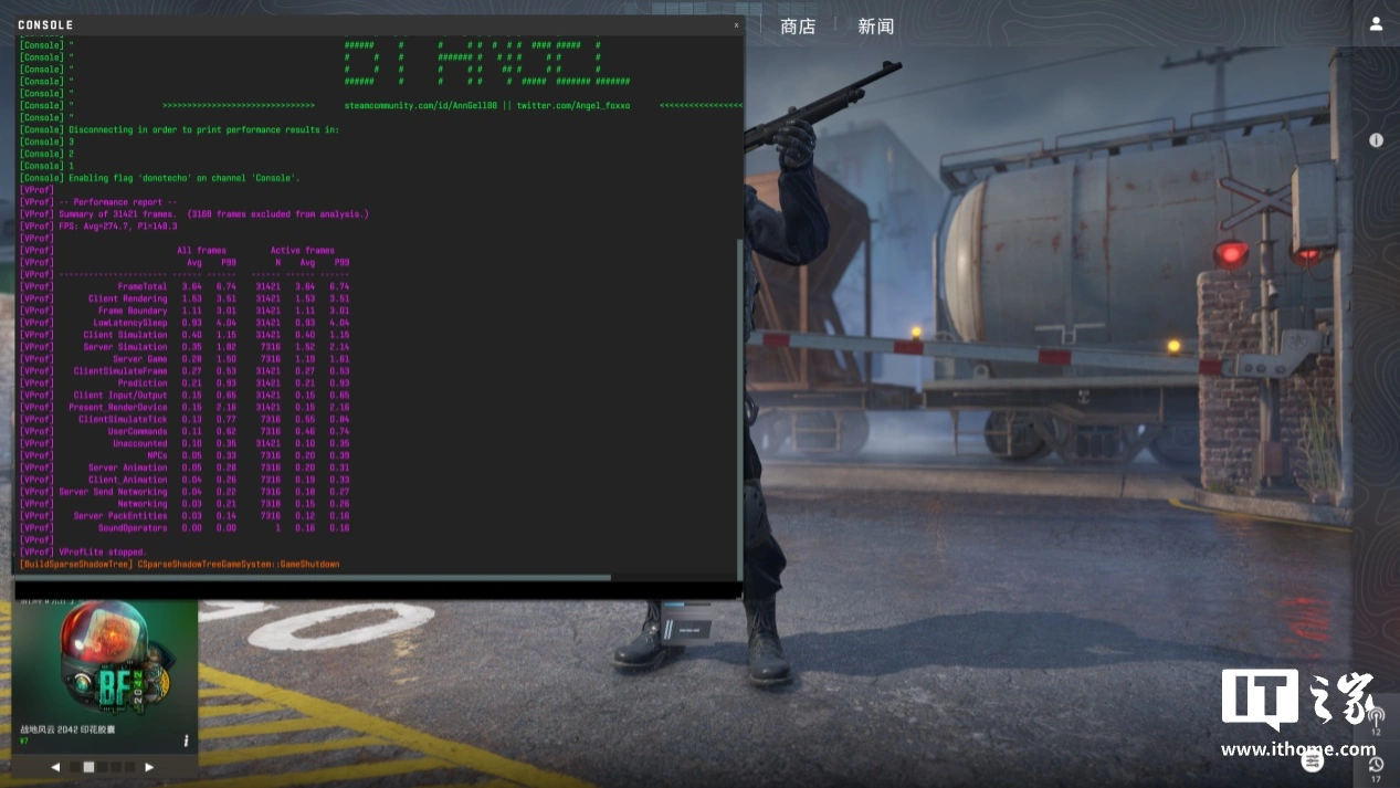 首先是两款在线竞技类游戏,在《CS2》中我们采用默认高画质选项,在 2K 分辨率下运行性能测试,影驰 GeForce RTX 4070 Ti SUPER 金属大师 Plus OC 的平均帧数来到了 274 帧。