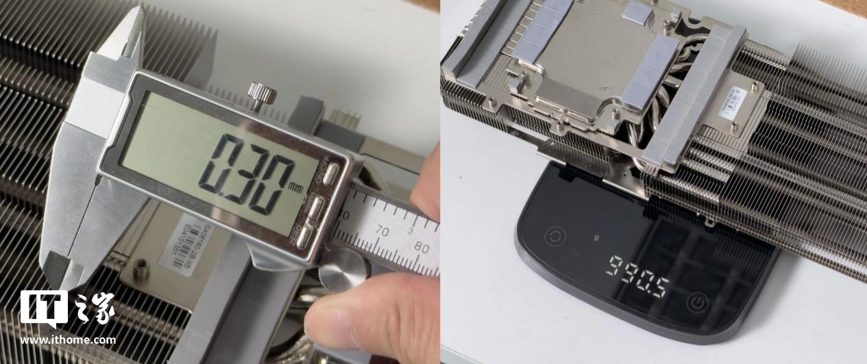 IT之家也实测了影驰 GeForce RTX 4070Ti SUPER 金属大师 Plus OC 的单片鳍片厚度,约 0.3mm,整个鳍片 + 热管 + 导热垫的重量约为 990,用料还是很扎实的。