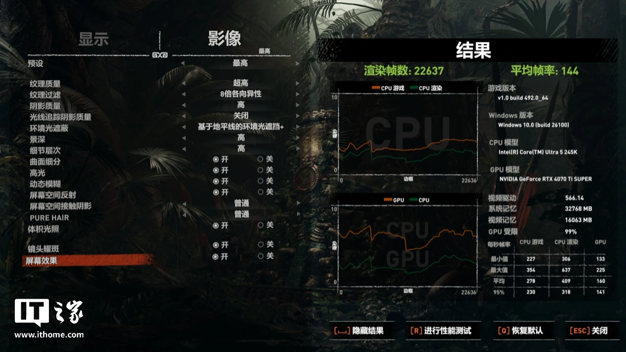 接着是 2 款传统光栅游戏,在经典动作冒险游戏《古墓丽影:暗影》中,在 4K 分辨率下,最高画质并开启光追 + DLSS 质量档时,影驰 GeForce RTX 4070 Ti SUPER 金属大师 Plus OC 的平均帧数为 144 帧,RTX 4070 为 103 帧,提升约 39%。