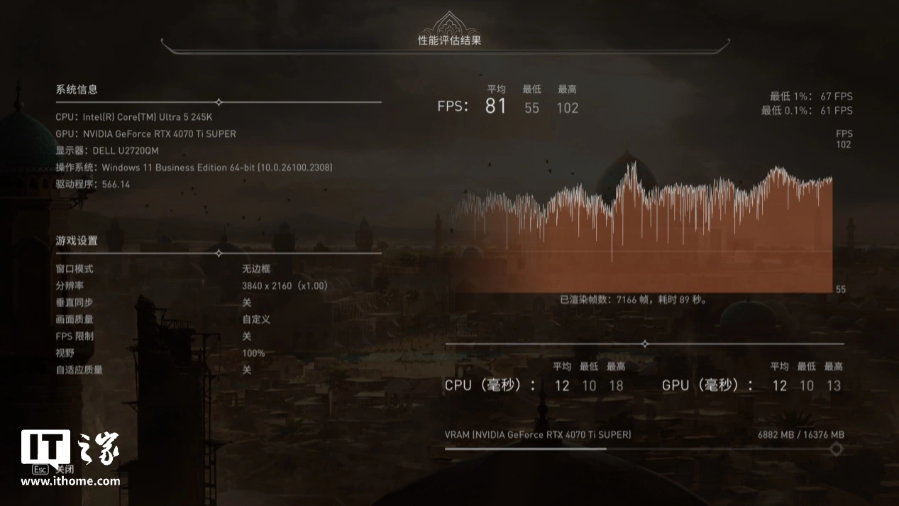 我们也测了育碧家的最新作《刺客信条:幻景》,作为“众生平等”的代表。进入游戏后我们选择 4K 分辨率下,DLSS 为质量档。影驰 GeForce RTX 4070 Ti SUPER 金属大师 Plus OC 的平均帧数为 81 帧,RTX 4070 Ti 的平均帧数则是 71 帧,提升了约 14.1%。看样子 RTX 4070 Ti SUPER 也能在 4K 分辨率下的流畅地潜行刺杀了。