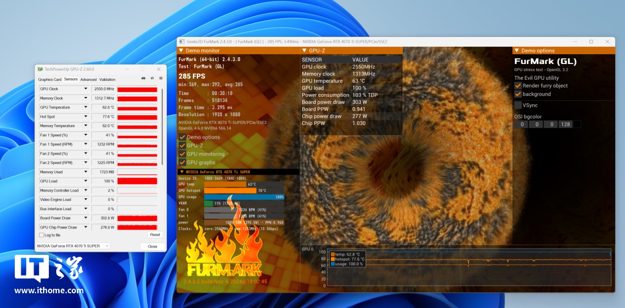 IT之家先是使用 FurMark 进行显卡单烤 30 分钟,显卡功耗维持在 303W 的高位,并且此刻显卡频率也能达到 2550MHz,性能释放还是比较激进的。与此同时,显卡温度和显存温度却分别只有 62.8°C 和 62 °C,此时风扇转速只有 1230,只有最高转速的 41%,散热性能非常优秀。