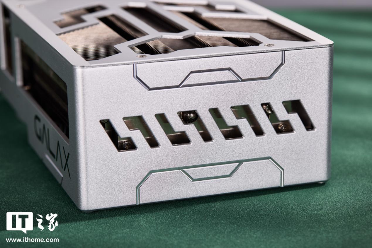 影驰 GeForce RTX 4070Ti SUPER 金属大师 Plus OC 的顶部采用大面积开孔加速出风,透过开孔能看见其内部的散热鳍片,显卡框架上印有 GeForce RTX 以及 GALAX 的 Logo。
