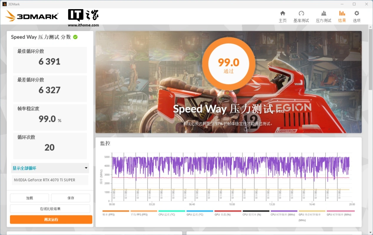 显卡稳定性方面,我们这次换成了比 Time Spy 负载更大的 Speed Way 压力测试,测试成绩同样需要达到或超过 97% 才算及格。影驰 GeForce RTX 4070Ti SUPER 金属大师 Plus OC 的最终成绩为 99.0%,最佳循环分数和最差循环分数仅相差 64 分,顺利通过测试。