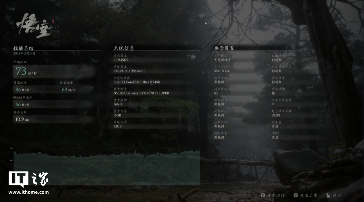 随后我们打开 DLSS3.5(全景光线追踪),运行性能基准测试,平均帧率依然有 73 帧。