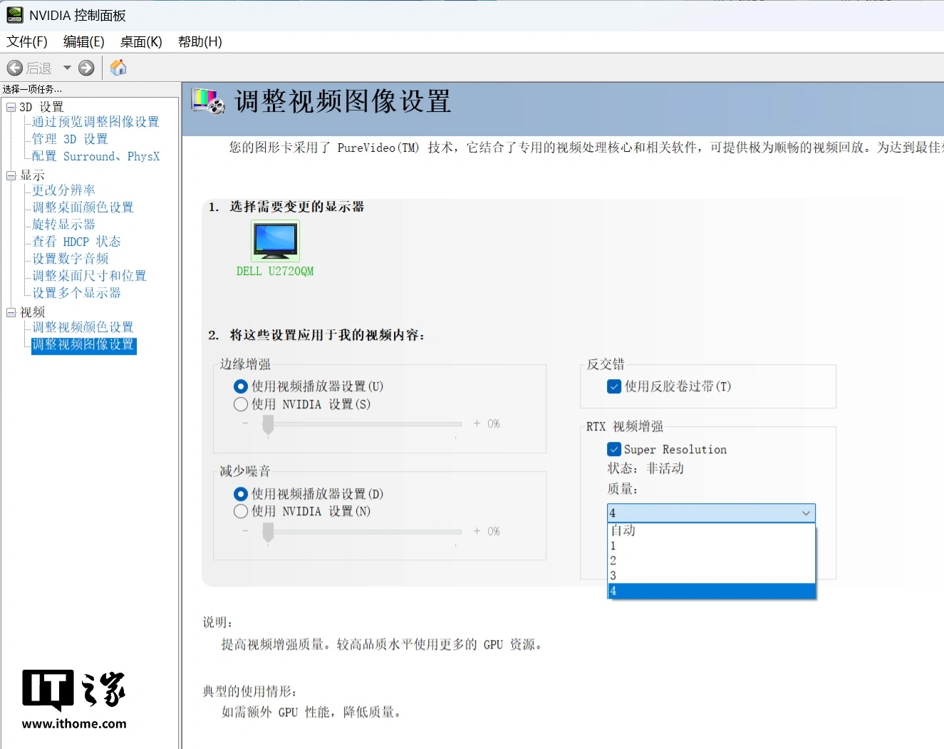 还有就是 RTX 视频超分辨率技术,它可以通过 GPU 的 AI 计算,至多将在线 1080P 视频提升到 4K 分辨率,实现以算法提高清晰度的效果。我们只需在 NVIDIA 控制面板中找到视频 —— 调整视频图像设置,便可以自定义调节。