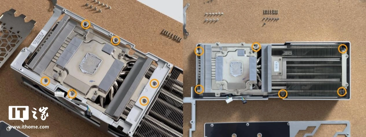 影驰 GeForce RTX 4070Ti SUPER 金属大师 Plus OC 还为供电以及显存处增加了导热垫为其散热,能进一步保证显卡持续峰值性能输出的稳定性。随后我们再拆下 12 颗螺丝,拆下中间的支架以及上盖。