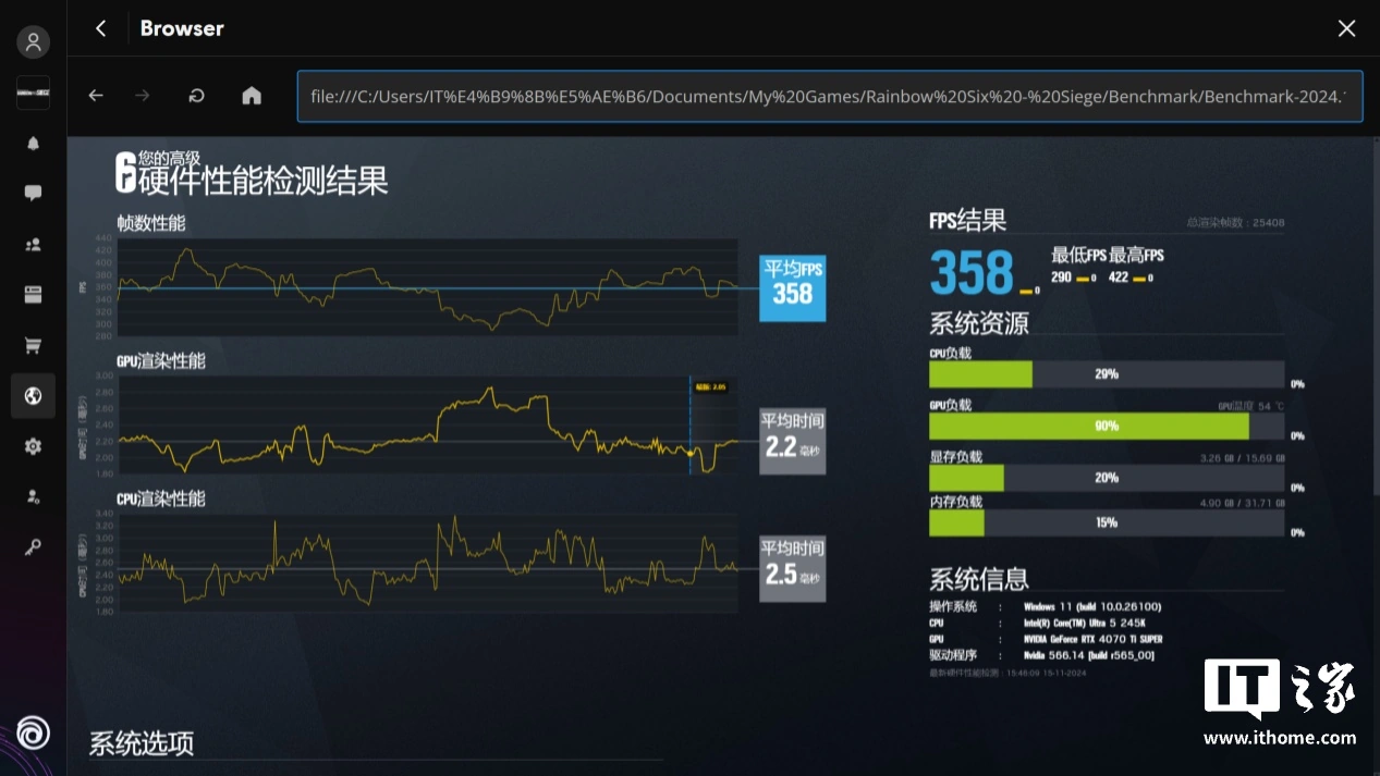 第二款在线竞技类游戏我们选择了人气颇高的《彩虹六号:围攻》,影驰 GeForce RTX 4070 Ti SUPER 金属大师 Plus OC 在 2K 分辨率,最高画质下的平均帧数达到了 358 帧,这个表现主流的 2K 高刷显示器根本难不倒它。