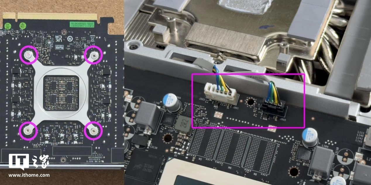 擦去硅脂,我们就能看到英伟达 RTX 4070 Ti SUPER 的核心了(蓝色),其基于 AD102 核心打造,采用了最新的 NVIDIA Ada 架构,而制程工艺则是定制的 TSMC 4N NVIDIA。GPU 核心周围为 8 片 2GB 的显存颗粒(紫色),共计 16GB 显存。再外一圈则是 10+2 相显卡供电(红色),可以为超频和高负载预留更多的性能释放空间。