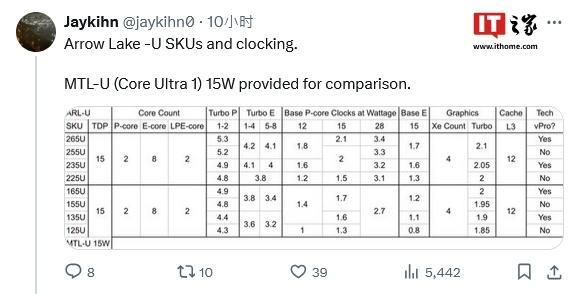 IT之家 11 月 18 日消息,X 平台消息人士 Jaykihn (@jaykihn0) 北京时间今日公布了面向超轻薄终端设备的英特尔 Arrow Lake-U 系列处理器的型号规划: