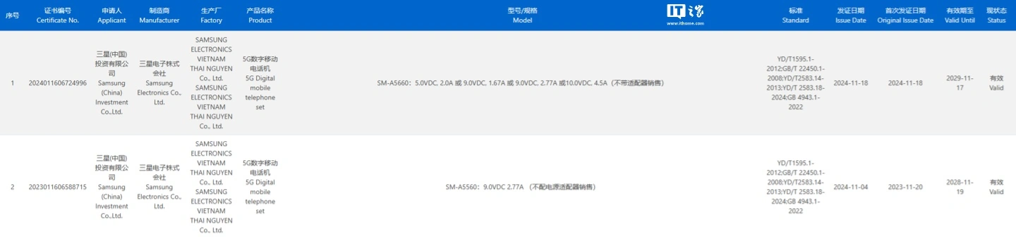 IT之家 11 月 19 日消息,三星 A56(SM-A5660)已于昨天通过 3C 质量认证,显示由三星越南工厂制造,支持 45W 充电但不附送充电器,而上一代 A55(SM-A5560)仅支持 25W 充电。