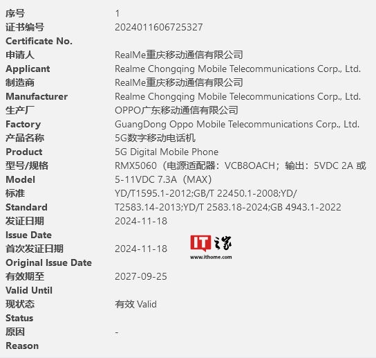 IT之家 11 月 19 日消息,型号为“RMX5060”的 realme 真我品牌新机通过 3C 认证,信息显示搭配 VCB8OACH 充电器,支持 5VDC 2A 或 5-11VDC 7.3A(最大 80W)快速充电。