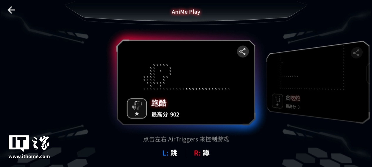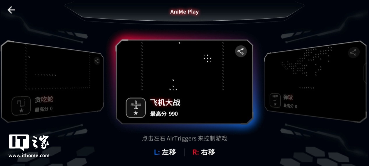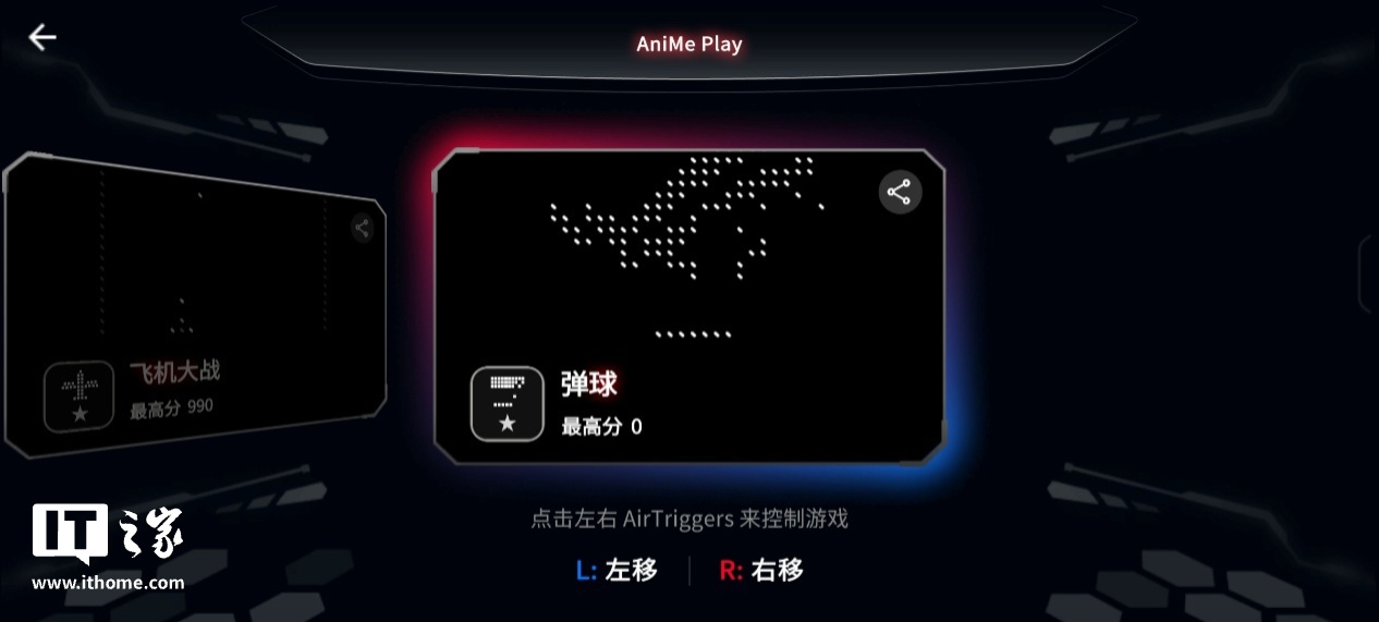 Anime Play 首发提供了 4 个经典复古像素风小游戏可供游玩,分别是:跑酷、贪吃蛇、飞机大战和弹球,虽然光显矩阵屏没有触摸功能,但 ROG 巧妙地通过 Air Triggers 压感肩键用最简单的方式模拟出类似掌机扳机的操控效果,在游戏中实现移动和转向等操作。