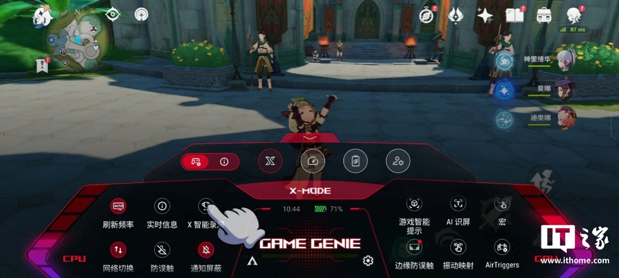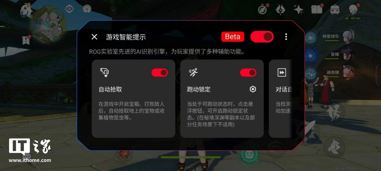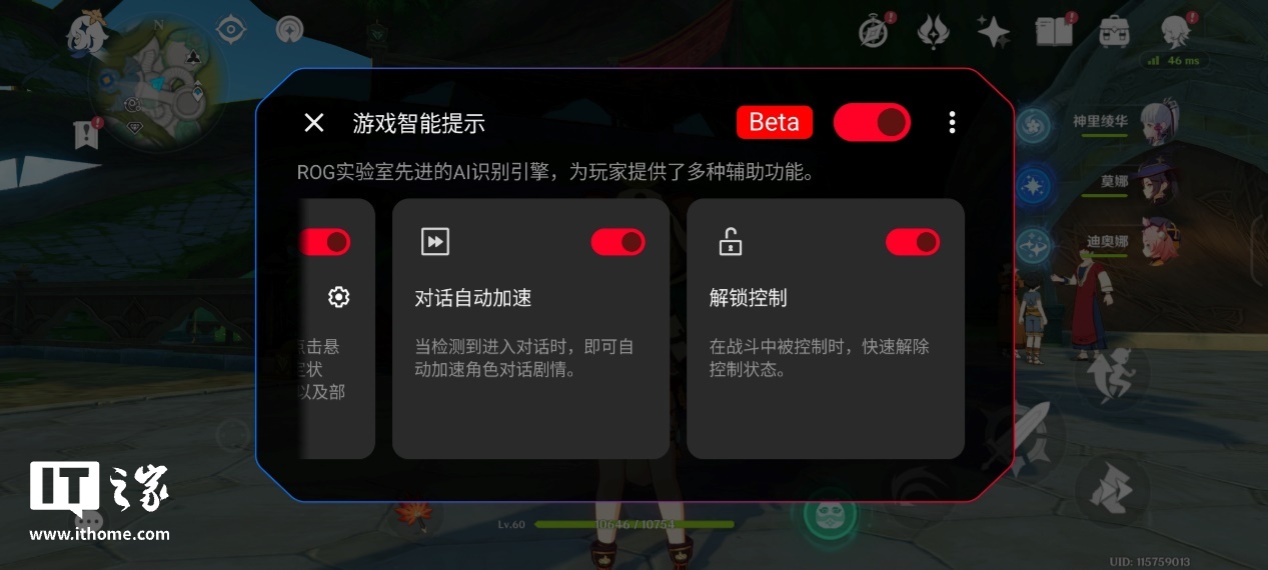 第三个和第四个也很厉害,不少原神玩家都吐槽过原神无法跳过剧情对话,如果不想看剧情用手一直点就很折磨,虽然游戏厂商这么做有自己的考量,但 ROG 还是从自己的角度尽可能帮助“跳过”党玩家提升游戏体验,即自动加速对话。而解除控制,相当于减少了角色受到控制类技能或元素反应后的僵直时间,经过IT之家的测试每项功能都可以顺利触发,玩家完全不用操心。