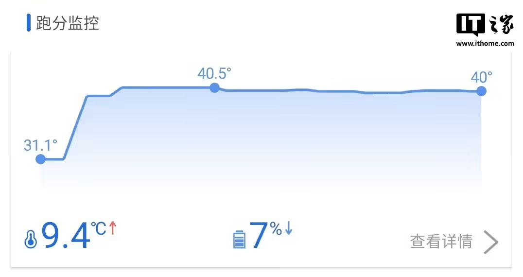 而在跑分温度表现上,同样是 31° 左右的起始电池温度进入跑分,上一代 ROG 8 Pro 跑分时温度由 31.1° 增长到 40.5°,温度升高了 9.4°,随后一直到跑分结束,电池温度始终维持在 40° 左右的高温。