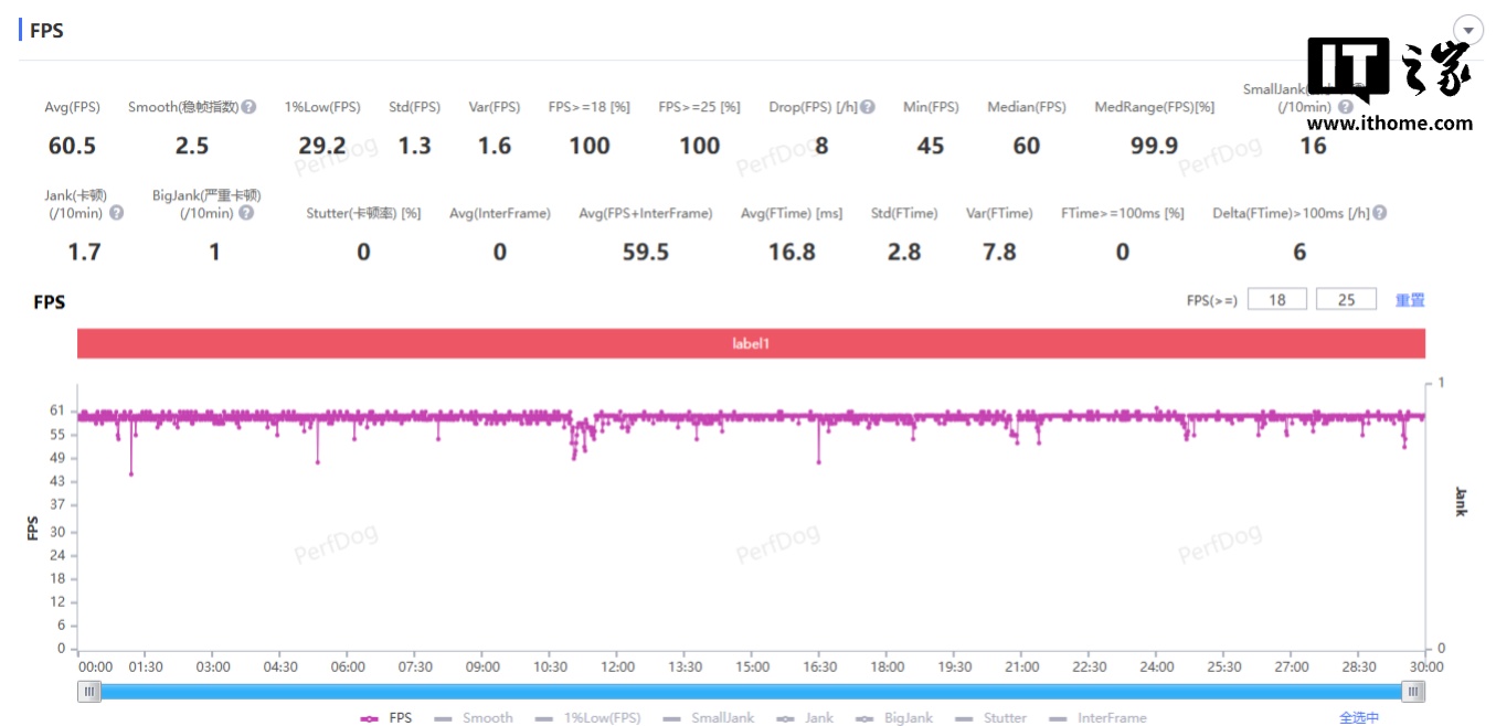 那如果我们用上散热背夹,让 ROG 9 Pro 满血发挥,《崩坏:星穹铁道》的表现能否更好呢?于是我们装上散热背夹,选择最高一档的酷寒散热模式,性能模式也自动切换到了 X+,此时再来 20 分钟的匹诺康尼跑图,这次《崩坏:星穹铁道》的帧率曲线表现明显好了不少,游戏平均帧数来到了 61 帧,稳帧指数也降到了 1.1。