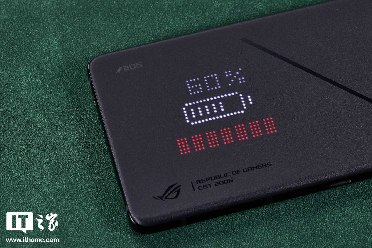 待机情况下,这块由 648 颗灯珠组成的全新 Mini LED 光显矩阵屏,会显示 3 种不同的动画,分别是 ROG Logo、当前时间以及电池剩余电量。即便用户将手机背部朝上放置在桌面上,不点亮屏幕就能知晓电量和时间信息,当然一旦收到了 App 通知,背屏也能亮起响应的提醒动画。